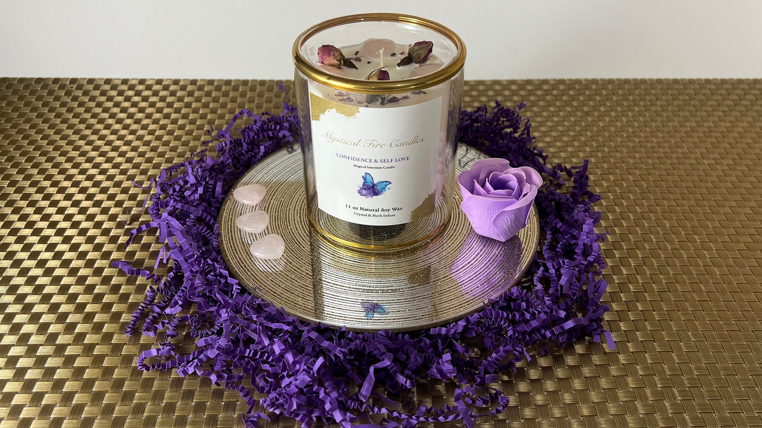 Hand made vegan and non-toxic soy based candles with carefully selected healing crystals and herbs.