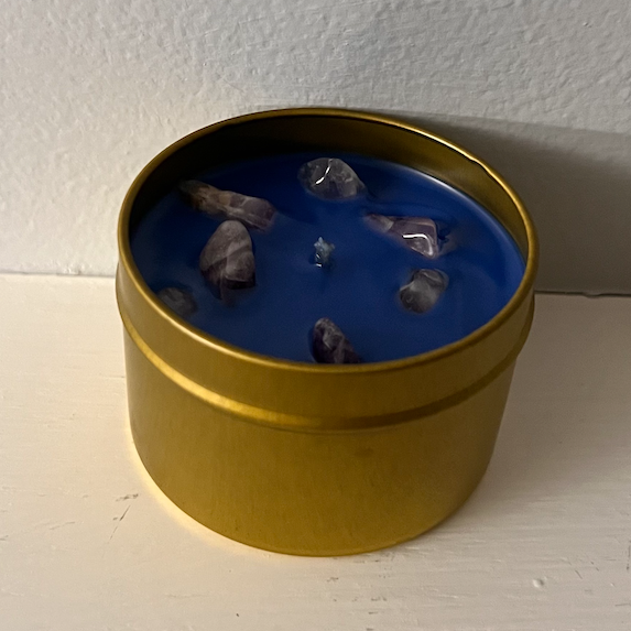 Awaken your intuition, insight, and spiritual vision. The indigo Third Eye Chakra candle enhances clarity, psychic awareness, and inner knowing. Embedded with Amethyst, this candle supports meditation, divination, and intuitive growth. The approximate burn time is 23 hours.